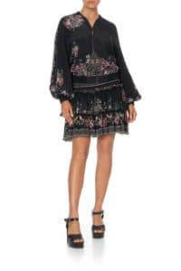 This pure silk short dress features a flattering V-neckline, adjustable shoestring straps, draw-cord CAMILLA beaded waist tie and hidden in seam pockets finished with statement hand placed crystal embellishments adorning the neckline and fluttering frill hem